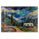 Agrega un toque personal de aventura a tu cocina con esta hermosa tabla de cortar estilo vidrio tintado que presenta un paisaje montañoso escénico y una acogedora camioneta camper.
