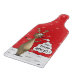 Un tablero del corte del vidrio en rojo con la imagen de un reno y de un él del dibujo animado es entusiasmo sobre la nieve que baja.
