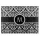 Damasco de hojas y pergamino en un patrón de estilo vintage, con detalles blancos sobre un fondo negro en la parte inferior con el reverso de negro sobre blanco en la parte superior; con banda y letra alrededor/inicial para alterar a la propia para personalizar.