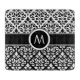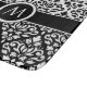 Damasco de hojas y pergamino en un patrón de estilo vintage, con detalles blancos sobre un fondo negro en la parte inferior con el reverso de negro sobre blanco en la parte superior; con banda y letra alrededor/inicial para alterar a la propia para personalizar.