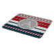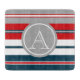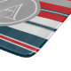 Diseño de temática náutica con decoración monográfica en forma redonda sobre fondo rayado azul, blanco, rojo y gris