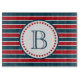 Diseño de temática náutica con decoración monográfica en forma redondeada con estrellas de fondo rayado azul, rojo y blanco