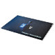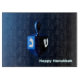 Un modernístico dreidel azul metálico contra un fondo oscuro y nocturno. Dos de las letras hebreas encontradas en un dreidel, una monja y un shin, brillan brillantemente. El texto que dice "Feliz Hanukkah" también aparece en azul brillante y blanco.