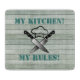 El diseño tiene un fondo de madera con un gráfico de dos cuchillos de corte y un gorra del chef en el centro. Encima del gráfico se muestra 'Mi cocina' y debajo 'Mis reglas' escritas en una fuente de esténcil. El texto puede cambiarse para adaptarlo a sus necesidades.