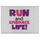 Si te gusta correr, correr 5 Ks, 10 Ks, media maratón o maratones, te encantará este colorido diseño de texto en morado y rosa que dice Correr y abrazar la vida! ¡Corre y abraza camisetas vitales, tazas, bolsas, tarjetas, pegatinas, cadenas de llaves, mousepads, estuches para iPhone, imanes y mucho más!