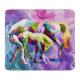 Caballos geométricos de colores vivos se encuentran en un entorno sicodélico y agitador. Tonos vivos de violeta, rosa y verde mezclados con motivos abstractos. Photoshop CS5 de arte digital