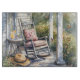 Este tranquilo diseño acuático capta la esencia de una tarde lenta y soleada en un porche campestre. Las glicinias en cascada florecen en suave violeta sobre una pérgola templada, enmarcando una escena tranquila centrada alrededor de una acogedora mecedora coronada por un cojín acolchado. Cerca hay un gorra de paja de paja de gran tamaño, que sugiere una compañía reciente, mientras que un vaso de limonada y un vaso de té invitan a la pausa y la reflexión. Las mariposas bailan suavemente por el aire, llevando el movimiento a la calma. El estilo pintado a mano le da un ambiente nostálgico y de ensueño, ideal para evocar recuerdos de retiros de verano, la vida de una casa de campo y momentos de reposo cuidadoso. Muestra esta escena en espacios donde la paz, el encanto y la naturaleza son bienvenidos, perfectos para leer un rincón, un solárium o una pared de galería de entrada. La IA generó obras de arte.