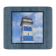 Diseño de temática náutica con decoración de faro acuático en un marco azul oscuro. Es posible cambiar el color de fondo y añadir uno diferente al diseño con su elección.