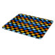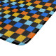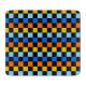 A vibrant checkerboard pattern featuring alternating rows of orange, yellow, light blue, and blue squares against a black background. The design is bold and energetic.