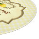 El diseño dulce presenta un gnome chica con un traje con estampado de limón, bordeado con un cartel que dice "Cuando la vida te da limones, haz algo dulce" sobre fondo de manta de búfalo amarillo pastel