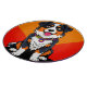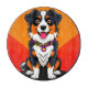 Encantador ilustracion de la cara de un perro alegre centrado en un atrevido fondo de círculo naranja, que exhibe colores vibrantes y un estilo divertido y personalizado.