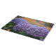 Esta tabla de corte de vidrio presenta flores de hidrangea violeta con un toque impresionista.