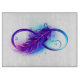 Símbolo infinito con una hermosa pluma pintada de color violeta y azul brillante sobre fondo blanco.