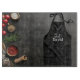 Esta tabla de corte de aspecto profesional Black Apron es perfecta para cualquier persona que ame cocinar, hornear o BBQ. Un delantal negro profesional sobre fondo negro con artículos de cocina en todo el edificio.