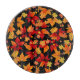 Medianoche de otoño, mostrar un patrón vibrante de hojas de otoño contra un fondo negro. Las hojas son una mezcla de tonos rojos, naranjas, amarillos y dorados, que representan una variedad de especies como el arce, el roble y el castaño. `el contraste entre los colores vivos de las hojas y el fondo oscuro crea un efecto llamativo y dramático, destacando los tonos cálidos y el detalle intrincado del follaje. hojas, bellotas y ramas más pequeñas se dispersan por todas partes, añadiendo profundidad y textura al patrón. El conjunto está decorado con un ambiente alegre y festivo de noche de otoño.