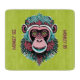 Diseño verde vivo con un ilustracion retrato de mono y mensaje de "ver mono, hacer mono".