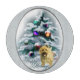 Exquisito arte navideño con un adorable cairn terrier parado frente a un árbol de Navidad lleno de nieve, decorado con adornos que parecen brillar a la luz de la luna. Maravillosos regalos para los amantes del cairn terrier.