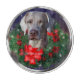 Maravilloso arte original de un Weimaraner rodeado por una corona de vacaciones. Bonitos regalos de Navidades para los amantes de Weim. Variedad de mercadería navideña. Los productos incluyen tarjetas de Navidad, ornamentos y ropa de Navidad.
