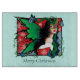 Un hada de cabello negro con todas las alas rojas de hadas verdes. Copos de nieve, poinsettia roja y mariposas azules alrededor del hada.
