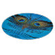 Cara de pájaro creada a partir de imágenes de plumas de pavo real reflejadas en un fondo metálico azul.