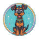 Adorable ilustracion al estilo personalizado de un feliz cachorro negro y marrón vestido con un collar azul y sentado contra un fondo colorido. Perfecto para diseños alegres, temas infantiles y proyectos relacionados con los animales.