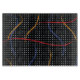 El estilo retro de los años 1980, la pintura de color primario traza un patrón de salpicadura en un fondo geométrico con puntos en blanco y negro.