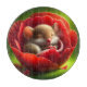Un ratón tierno y esponjoso durmiendo pacíficamente dentro de una vibrante flor de amapola roja. Los pétalos de la flor son suaves y detallados, rodeando el ratón como una cama acogedora. El entorno está decorado con suaves tonos verdes que crean un ambiente sereno y tranquilo, con un toque de luz brillante que le da un toque mágico.