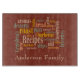 Utilice esta receta de "Family Name Recipe Sayings Burnt Umber Cutting Board" en su cocina y hágalo una conversación con sus invitados. El cristal decorativo luce un fondo de madera quemada y recetas como: aromas, asado, barbacoa, castañas, platos favoritos, pan, pudding, fritura, postres, marinados, caramelos, parrilladas, etc. Puedes añadir tu nombre y emparejarlo con productos coordinados con el mismo diseño de mi tienda para completar tus accesorios de cocina. La tabla de cortar también es ideal para regalos a recién casados o para eventos de limpieza. Diseño ©Diseño costero sur.