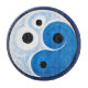 Una representación moderna de yin yang en colores azul y blanco contra un telón de fondo de relajantes formas geométricas circulares, simbolizando el equilibrio de energías opuestas en la vida contemporánea.
