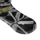 Un intrincado patrón de cruces y círculos grises que se entrelazan sobre un fondo negro con sólo un toque de color.