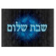 Incluye texto en hebreo que dice: "Shabbat Shalom" (ש ב ת ש ם), "un Sábado pacífico" o "Sabbath of peace", en azul brillante y blanco sobre una imagen de fondo azul y fractal. Una bonita tabla de corte para tu Shabbat Challah.