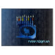 Una menorah modernista, metálica y azul Chanukkah, con un león en silueta, sobre un fondo oscuro y nocturno. Las nueve velas están encendidas. El texto en hebreo que dice "Chag Chanukkah Sameach" (Feliz Hanukkah) también aparece en azul y blanco resplandeciente.