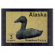 Una estampilla de un mítico Alaska independiente con una piedra en la piedra de un pato Eider. El fondo es la piel de alce curtido en el cerebro. Esta es una representación digital, no un objeto de piedra angular real. El éter común, Somateria mollissima, es el pato más grande que se encuentra en Europa y en Norteamérica (excepto el pato de la Muscovy que sólo llega a Norteamérica en estado salvaje en el sur de Texas) El éter se distribuye en las costas del norte de Europa, Norteamérica y Siberia oriental. Se cría en el Ártico y en algunas regiones templadas septentrionales, pero inviernos un poco más al sur en zonas templadas, cuando puede formar grandes manadas en aguas costeras. Puede volar a velocidades de hasta 113 km/h. El Eider se caracteriza por su forma voluminosa y su gran billete en forma de cuña. El macho es inconfundible, con su plumaje blanco y negro y su uva verde. La hembra es un pájaro marrón, pero aún se puede distinguir fácilmente de todos los patos, excepto de otras especies de eider, en función del tamaño y la forma de la cabeza. El llamado de este pato es un agradable "ah-ooo". La especie suele ser fácilmente accesible. Los brotes de las razas europea, oriental de América del Norte y asiática/occidental de América del Norte pueden distinguirse por pequeñas diferencias en el color del plumaje y del billete. Esta especie se inmersa en crustáceos y moluscos, siendo los mejillones un alimento favorito. El Eider comerá los mejillones tragándolos enteros; los cáscaras se aplastan en sus estómagos y se excretan. Cuando se come un cangrejo, el Eider se quita todas sus garras y piernas y luego se come el cuerpo de manera similar. Es abundante, con poblaciones de entre 1,5 y 2 millones de aves en América del Norte y Europa, y también grandes pero desconocidos en Siberia oriental. Una colonia particularmente famosa de eiders vive en las Islas Farne en Northumberland, Inglaterra. Estas aves fueron objeto de una de las primeras leyes de protección de aves de la historia, establecidas por Saint Cuthbert en el año 676. Aproximadamente 1.000 pares aún anidan allí cada año. Como San Cuthbert es el santo patrono de Northumberland, era natural que el eider fuera elegido como el ave emblema del país; a los pájaros se les sigue llamando patos de Cuddy en la zona, siendo "Cuddy" la forma familiar de "Cuthbert". El éter común es una de las especies a las que se aplica el Acuerdo sobre la conservación de las aves acuáticas migratorias de África y Eurasia (AEWA). Eiders son criadores coloniales. Se anidan en las islas costeras en colonias de menos de 100 a más de 10.000 a 15.000 individuos. Las novillas suelen presentar un alto grado de fiopatía natal, donde vuelven a la raza en la misma isla donde fueron nacidas. Esto puede conducir a un alto grado de relación entre los individuos que anidan en la misma isla, así como el desarrollo de estructuras sociales femeninas basadas en la familia. Es probable que esta relación haya jugado un papel en la evolución de los comportamientos de reproducción cooperativa entre los eidros. Ejemplos de estos comportamientos son poner huevos en los nidos de personas relacionadas y crèching, donde las criadoras se unen y comparten el trabajo de criar patos. El nido del eider está construido cerca del mar y está bordeado por el célebre edredón, arrancado del pecho de la mujer. Este revestimiento suave y cálido ha sido cosechado durante mucho tiempo para rellenar almohadas y edredones, pero en los últimos años se ha substituido en gran medida por otras opciones sintéticas y de granjas nacionales. Aunque las almohadas o colchas de plumón son ahora una rareza, la recolección de plumas continúa y es sostenible, ya que se puede hacer después de que los patios salgan del nido sin dañar a las aves.