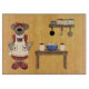 El caprichoso Oso Teddy vestido con un vestido rojo con un rufidoso cuello blanco, una banda de cabeza a juego y un delantal blanco con corazones en los bolsillos. Ella se para junto a su mesa de hornear, con un tazón y unas latas de ingredientes. En la pared hay una repisa con estantes y varios utensilios colgados del estante. El fondo es un aspecto de grano de madera.