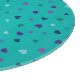 This glass cutting board features hand-drawn tiny hearts in shades of purple, blue and teal on turquoise.