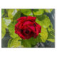 Fotografía de cerca de una rosa roja brillante impresa en un tablero de cristal.