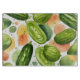 A funny cutting board with pickles and orange splatter this can be a fun gift idea to cheer up or say thank you between friends. The art is cartoon watercolors of whole and halved pickles.