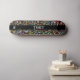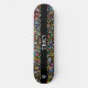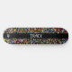 Tablas de skate de la marca Dd, con obra de arte gráfica de flores coloridas sobre fondo negro. Una franja negra audaz corre verticalmente por la tabla. Personalice el texto blanco personalizado según sus necesidades.