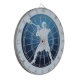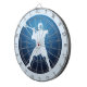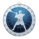 Pistola de LaCrosse. Bloqueado, amontonado y aliste para oscilar. Silueta del jugador del lacrosse que sostiene el palillo, en medio de encender un tiro en meta. El diseño circular del emblema en azules con la emanación irradia. Tablero de dardo del jugador de LaCrosse.