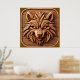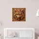 La talla de la cabeza de lobo intrincadamente elaborada presenta patrones geométricos, resaltados hermosamente contra tablas de madera rústica. El diseño detallado y los colores vívidos muestran la habilidad experta y la creatividad artística.