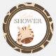 Este elegante pegatina de moda para niños/ducha neutra redondeada tiene un suave color tostado y un fondo de jirafa marrón chocolate oscuro con un marco marrón, marrón y blanco en el medio. En la parte inferior, hay una bonita cabeza de cebra mirando a la vuelta de la esquina. En la parte superior, el Baby está escrito en una fuente cursiva de moda con ducha escrita en un marrón oscuro debajo. Algunos elementos de diseño son de STOCKBERRY STUDIO.