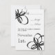 Tarjetas RSVP de boda (Tarjetas de visita Chubby) con un esquema de color negro y marrón. Ilustraciones de flores negras en las esquinas superior izquierda e inferior derecha. Texto negro. Invitaciones coincidentes en el periódico de Jill.