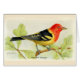 Dibujo vintage de un ave de Tanager Occidental con la cabeza roja y el pecho amarillo sobre un fondo gris. Este dibujo de colores del Western Tanager proviene de la antigua serie de tarjetas publicitarias Arm and Hammer Baking Soda.