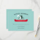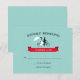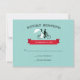 Cartas rsvp de boda en bicicleta tándem con la novia y el novio montando una bicicleta tándem. Tipografía vintage y una pancarta roja sobre un fondo acuático. Obtén las invitaciones a la boda de la bicicleta tándem.