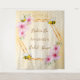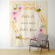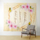 Elegante, divertida, tapiz para despedida de soltera de verano. Fondo amarillo y blanco con un patrón de panal. Con un marco geométrico de oro falso. Decorado con flores tropicales rosadas, hibiscos y abejas felices. Con el texto: Novia Abeja y el nombre de la novia. Plantilla para el nombre de la novia y una fecha. Se puede utilizar como decoración de pared para la fiesta de soltera o como telón de fondo para fotos.