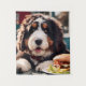 Un adorable Bernerdoodle en la cena con una hamburguesa de queso que ha pedido arte generado por IA