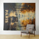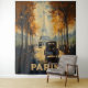 Poster de viajes de época que exhibe una romántica escena callejera de París de los años 30. La Torre Eiffel se alza con elegancia al fondo, enmarcada por árboles otoñales con hojas doradas. Los coches clásicos y las lámparas de calle bordean la carretera de adoquín húmeda, lo que cautiva el encanto de París en una época pasada. La palabra "PARÍS" aparece de manera prominente en la parte inferior en negrita, enfatizando el encanto eterno de la ciudad.