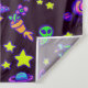 Una bonita escena espacial llena de estrellas amarillas, planetas coloridos y personajes adorables. Un extraterrestre verde con zapatos de cohete, una flor alienígena en una olla de flores, un cohetes futurista retro con una dama y su mascota gato montando en él, y un platillo volador con un extraterrestre feliz que le saca los ojos. Con MLO, la firma de los artistas, escondida bajo los planetas.