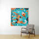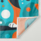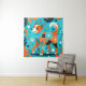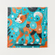 En la pieza digital titulada "Canina Aqua-Naranja", un personaje de perro abstracto contra un fondo acuático lleno de círculos y elementos decorativos intrincados en una mezcla congruente de tonos negros, acuáticos y naranjas. El canino naranja se representa en un estilo minimalista, caracterizado por los patrones giratorios que lo envuelven, y que irradia una sensación de zumbido y calidez.