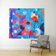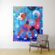 En la pieza digital titulada "Canina Aqua-Naranja", un personaje de perro abstracto contra un fondo acuático lleno de círculos y elementos decorativos intrincados en una mezcla congruente de tonos negros, acuáticos y naranjas. El canino naranja se representa en un estilo minimalista, caracterizado por los patrones giratorios que lo envuelven, y que irradia una sensación de zumbido y calidez.